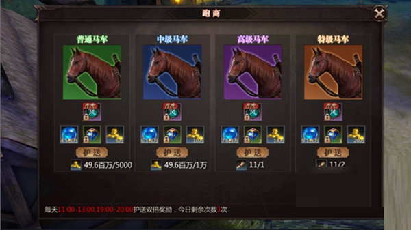 6、需要注意的是每日11:00~13:00和19:00~20:00期间进行护送有固定次数的双倍奖励,尽可能这时候选择最高等级马车进行运送。