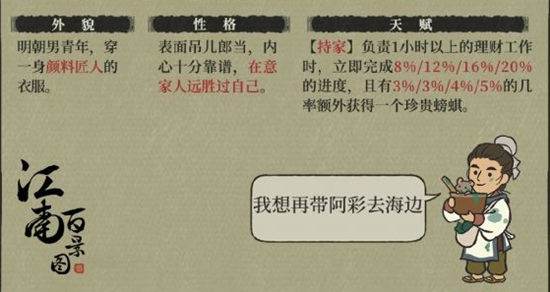 天赋:负责1小时以上的理财工作时,立即完成8%/12%/16%/20%的进度,且有3%/3%6/4%6/5%的几率额外获得一个珍贵螃蜞。
