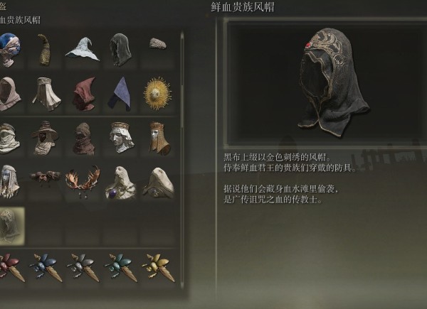 艾尔登法环鲜血贵族风帽是游戏中的贵族们才能穿戴的防具,帽子上面有金色的刺绣,佩戴之后给人一种华丽的感觉,玩家可以前往化圣雪原区域击杀红名NPC获取该装备。