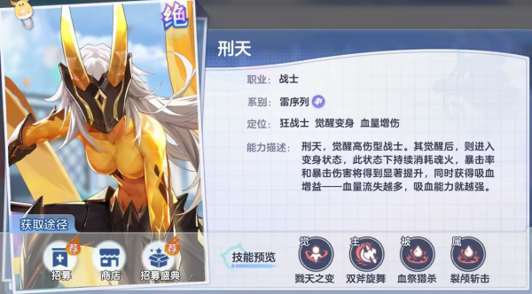 1、刑天的强度在战士中是非常高的有T0级别,属于雷序列角色。