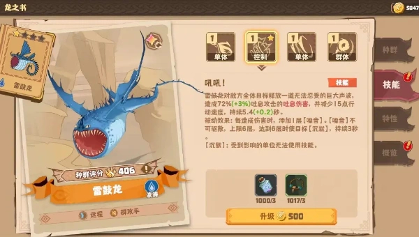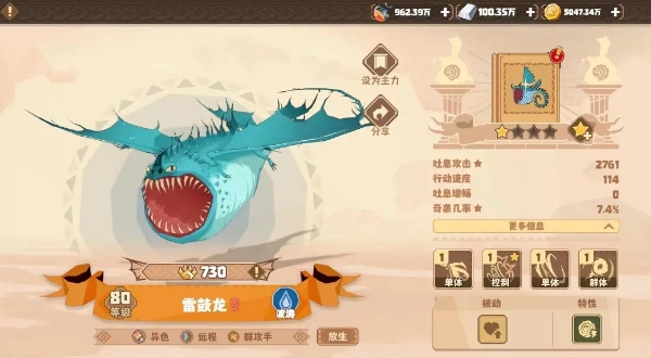 驯龙高手旅程雷鼓龙是水生纲里的金色龙,定位是远程群攻手,有着不错的吐息共计能力,速度也非常快,获取难度也比较高,可以更好的进行伤害输出。