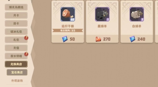 4、使用蓝宝石可以在兑换商店中购买白绵羊、运行干粮等不同的物品。