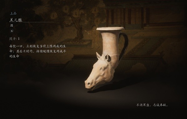 上品酒,每喝一口就能立即回复上限两成的生命值,短时间内储蓄恢复两成半的生命值。