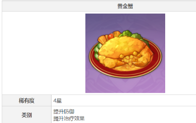 黄金蟹能为团队内所有角色提供242~308点防御力加强和6%~10%治疗效果增益,维持时长300秒。