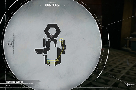 4、接下来,沿黄圈指示下至最高层宝箱左侧下方楼梯,进入中层,按黄线行进至最南端。
